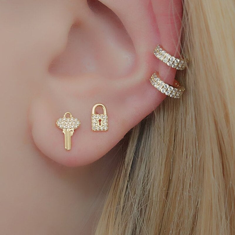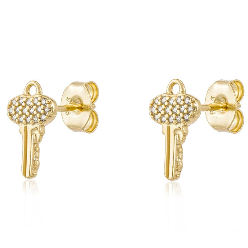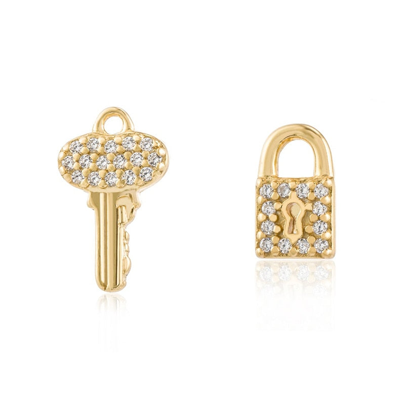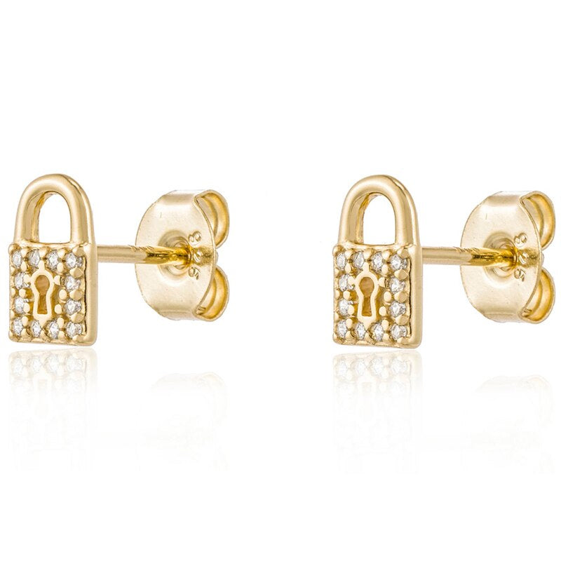 Yellow Gold Lock & Key Pave Stud Earrings
