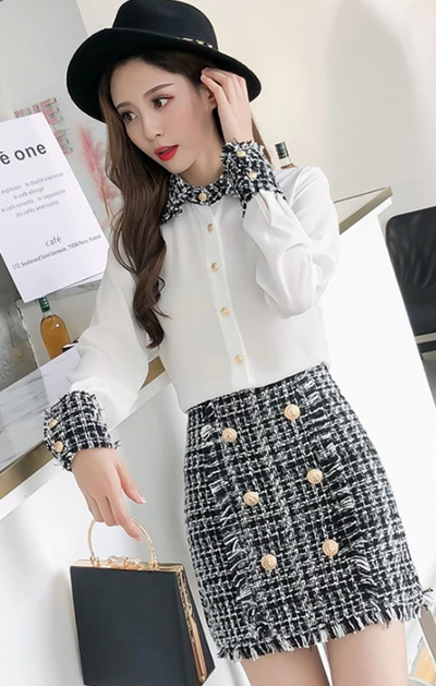 Tweed Gold Button Skirt & Blouse 2 Piece Set