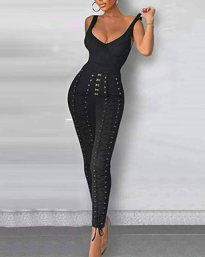 V-Neck Lace Up Pants Bandage Style Jumpsuit