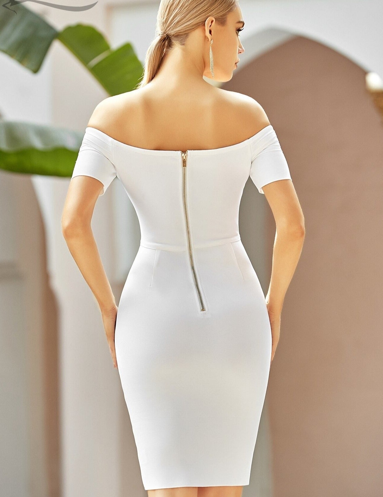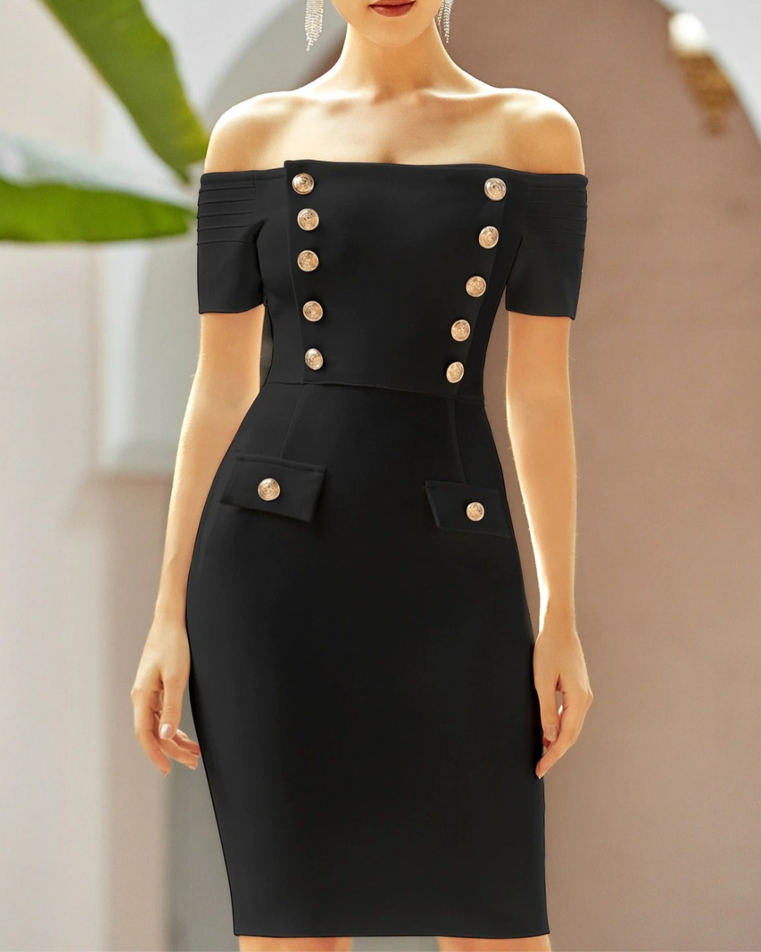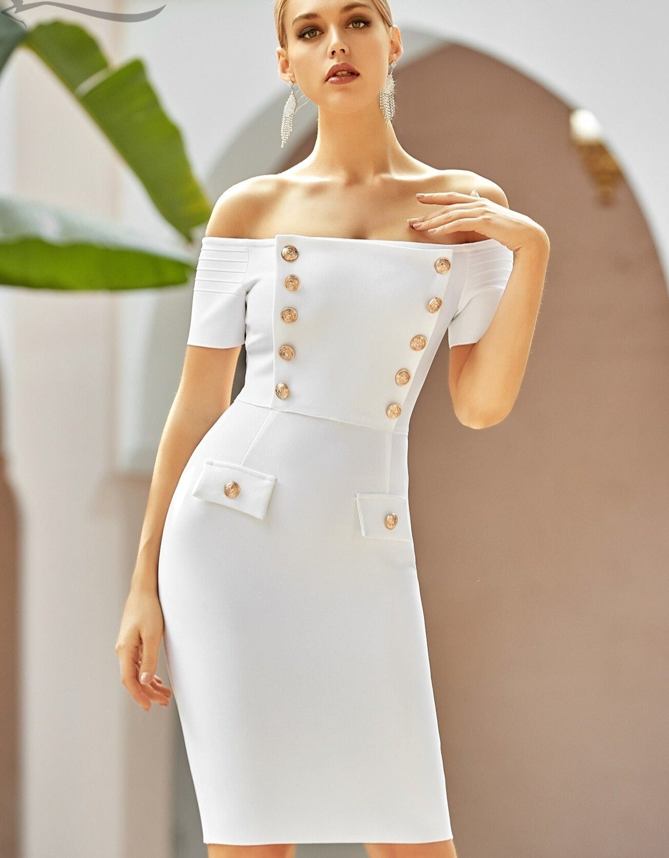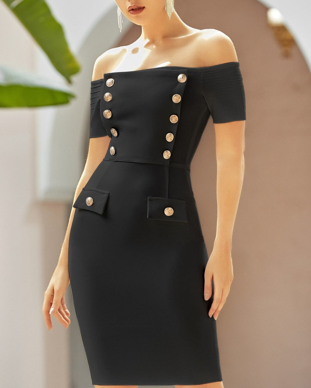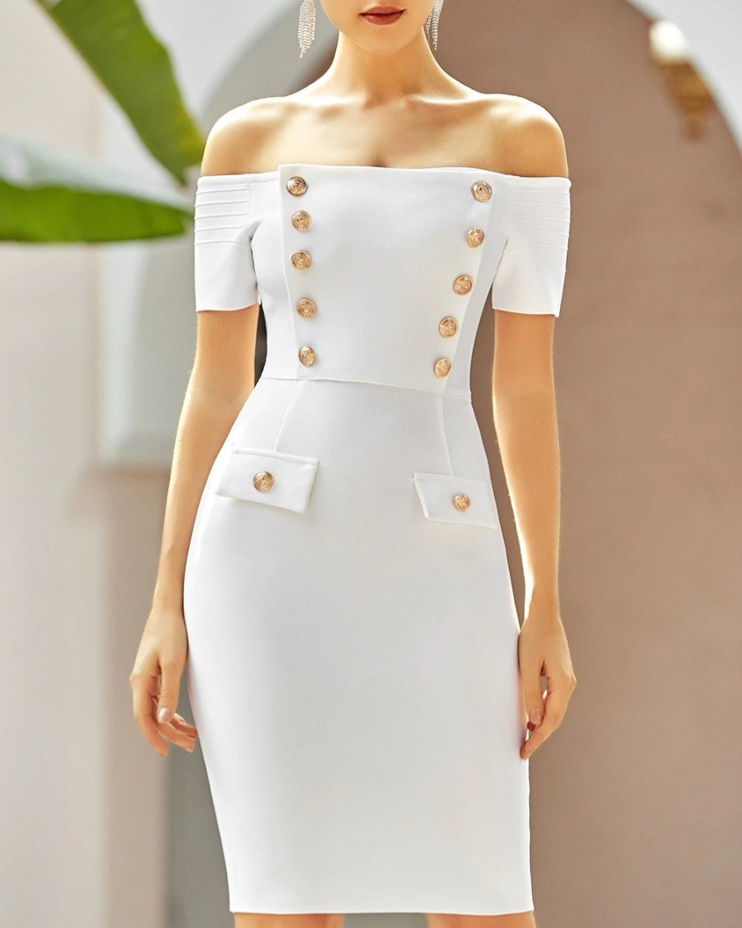 Off The Shoulder Gold Button Bandage Dress