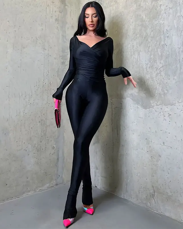 Black Off The Shoulder Ruched Two Piece Top & Pants Set