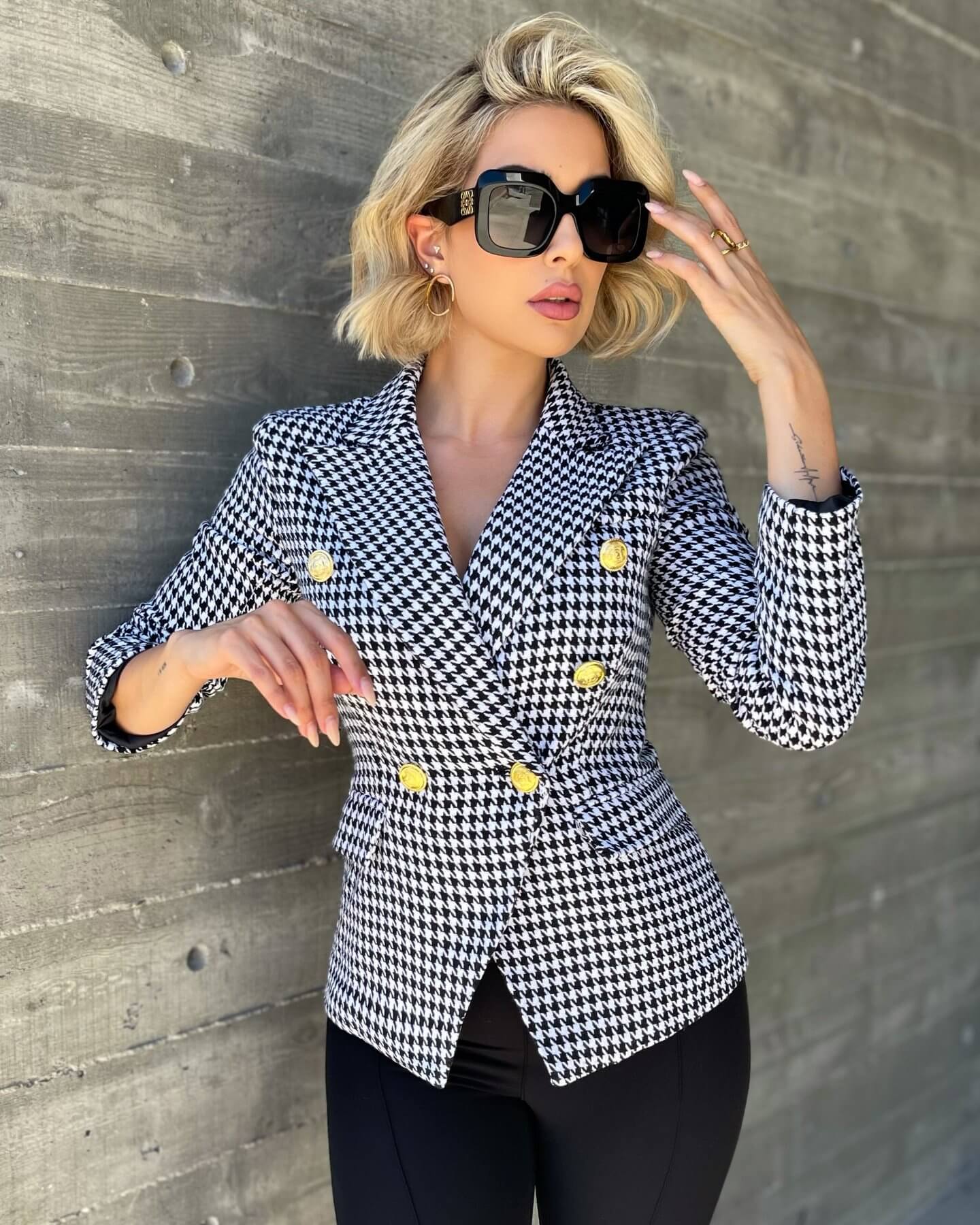 Houndstooth Double Breasted Gold Button Blazer